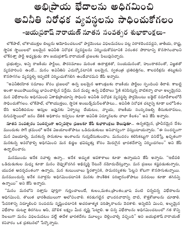 Conveying his greetings to all sections of people on the eve of the New Year, Dr. JP said that in the march of a great and ancient nation, there are inevitably many triumphs and tribulations. "Let us on this occasion recall our triumphs and count our blessings. If we work together, we can and will surely overcome hurdles and build a better India for the future of our children."
